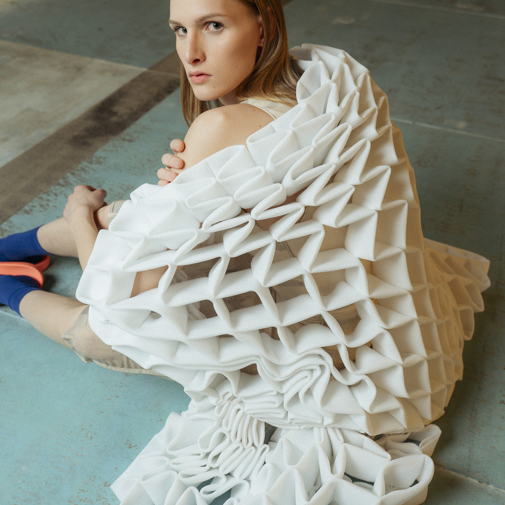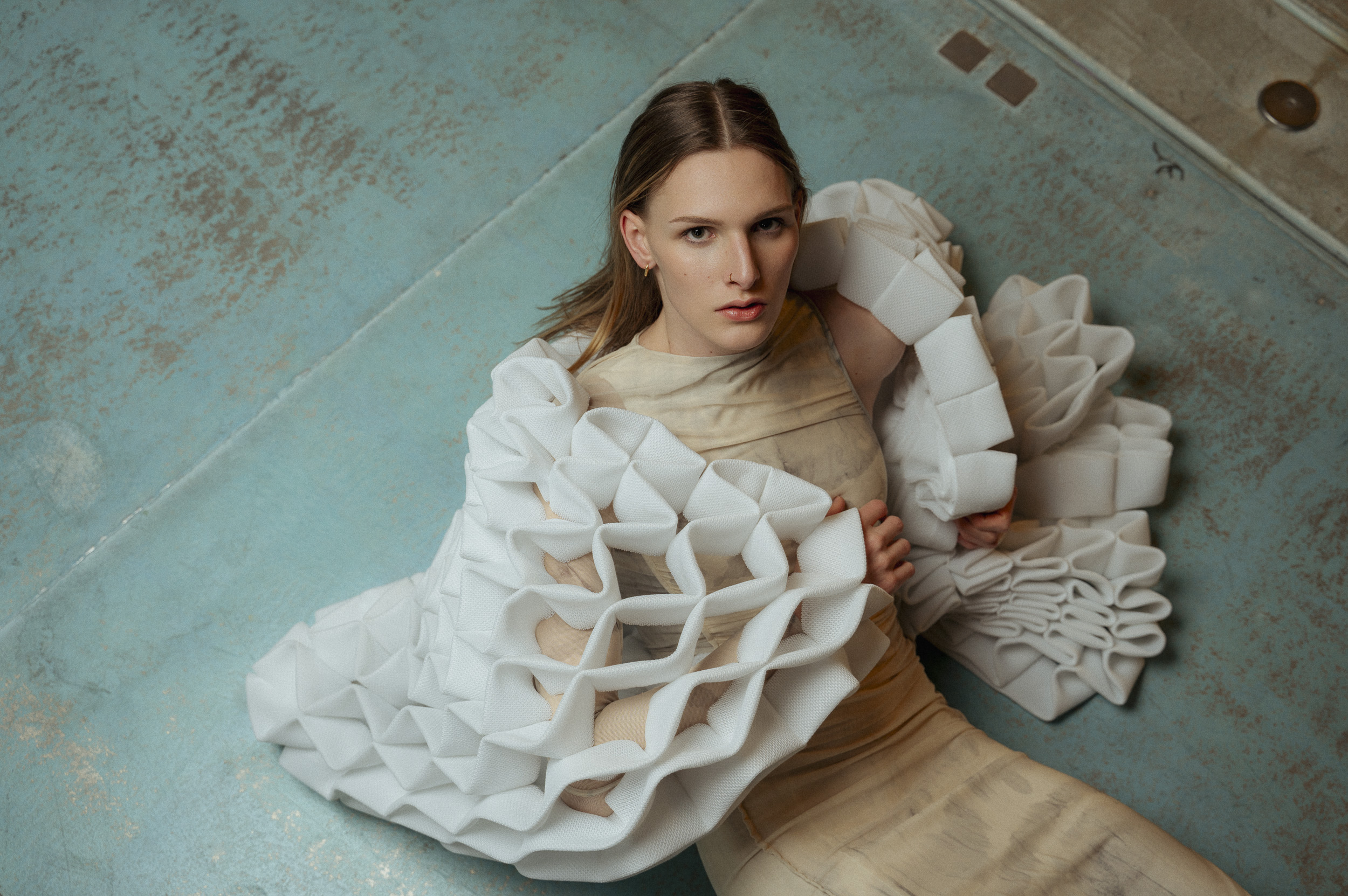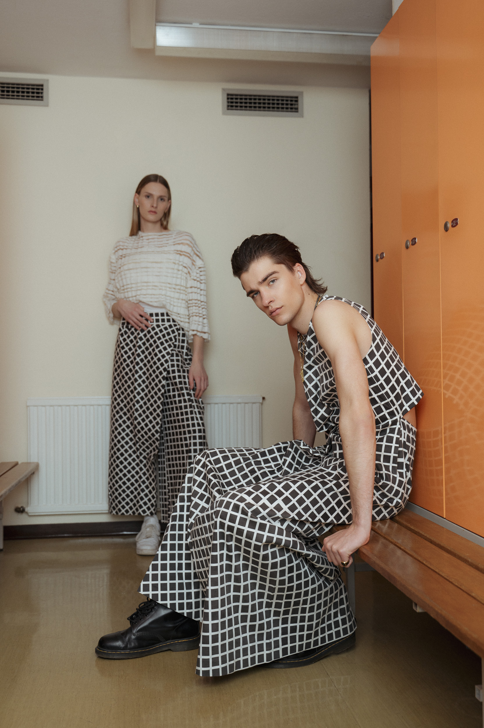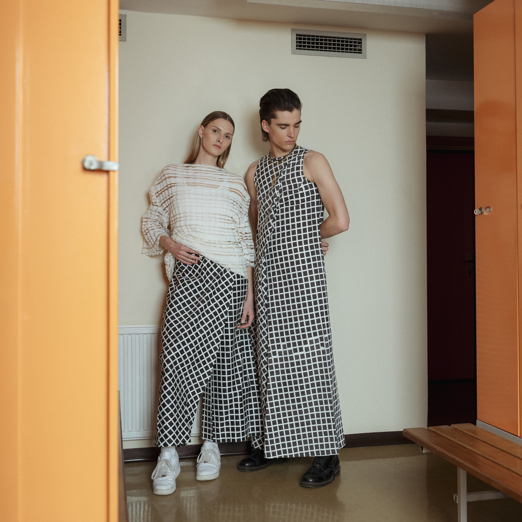 Die Outfits stammen von Absolvent*Innen der Kunstuniverstität Linz, Fashion & Technology und wurden eigens für das Fotoshoot mit alltäglichen Kleidungsstücken kombiniert, um einen möglichst spannenden Kontrast zu erzeugen. Zuständig für das Styling war Darija Pejić, ebenfalls Studentin und Designerin der Kunstuniversität Linz.