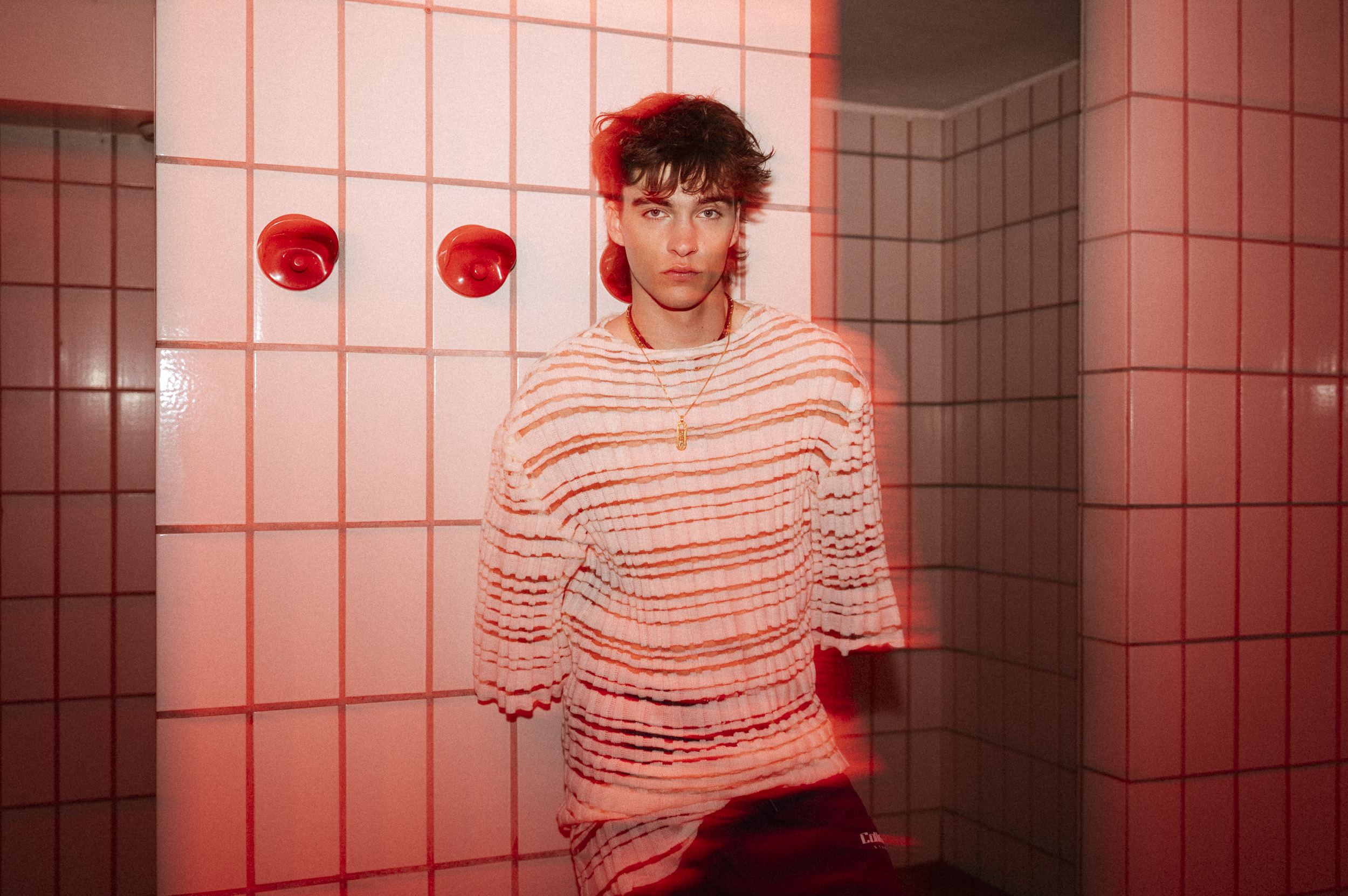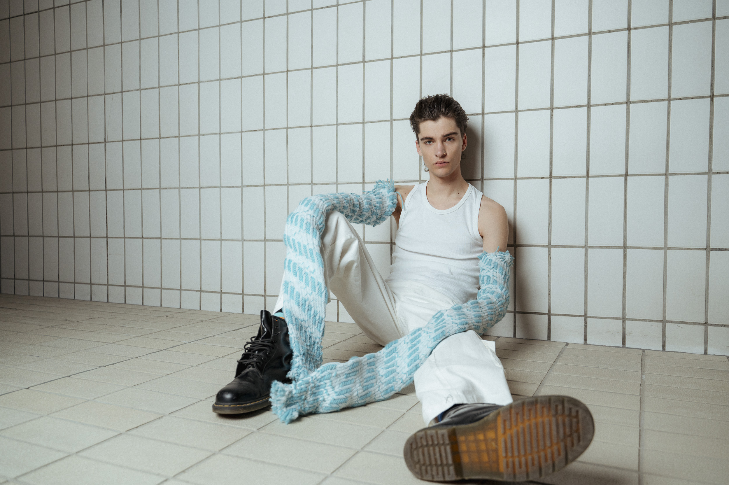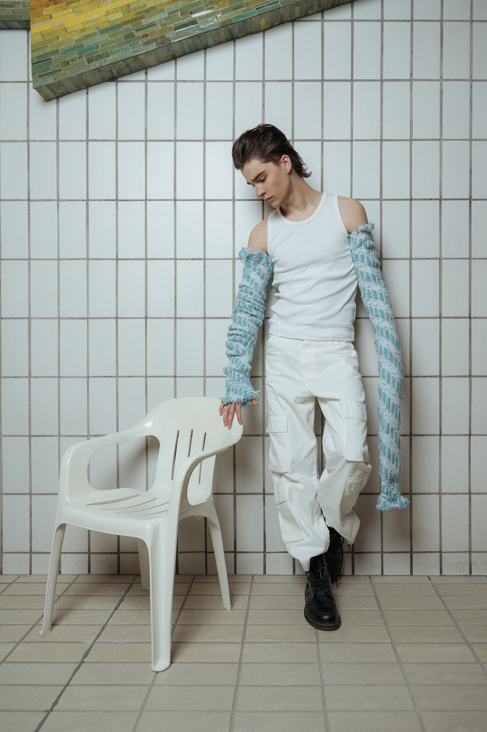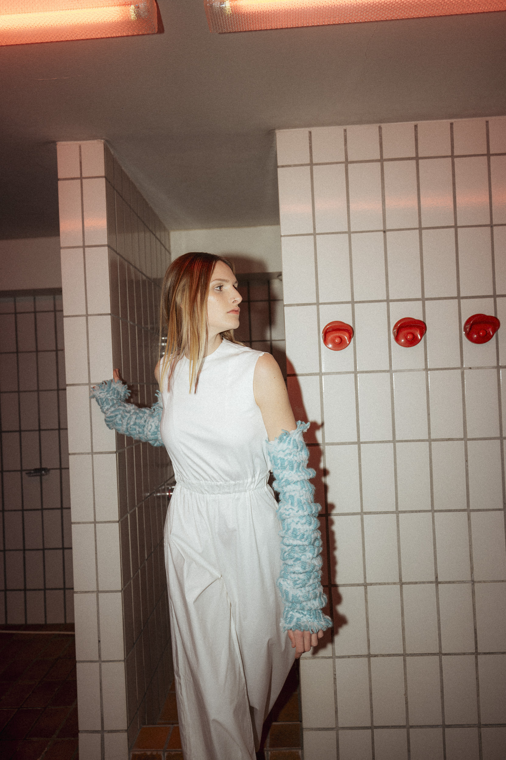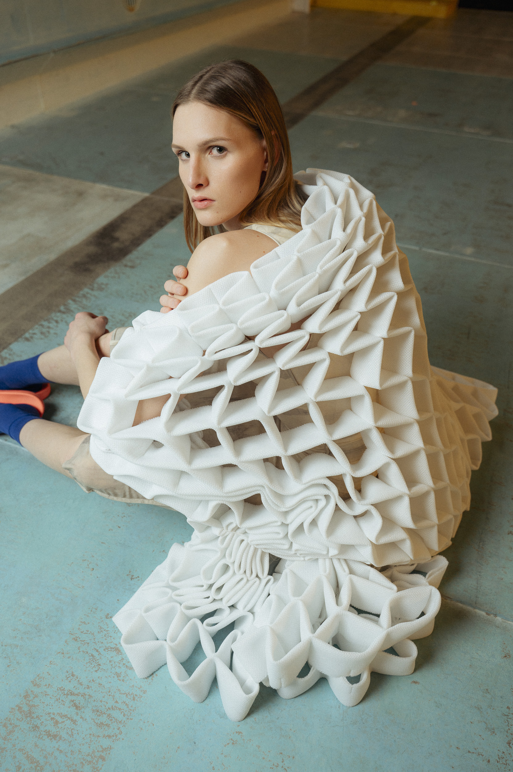 Die Outfits stammen von Absolvent*Innen der Kunstuniverstität Linz, Fashion & Technology und wurden eigens für das Fotoshoot mit alltäglichen Kleidungsstücken kombiniert, um einen möglichst spannenden Kontrast zu erzeugen. Zuständig für das Styling war Darija Pejić, ebenfalls Studentin und Designerin der Kunstuniversität Linz.
